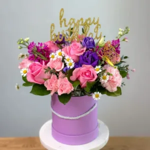 Birthday flower boxes—luxury blooms arranged in chic, reusable hat boxes.