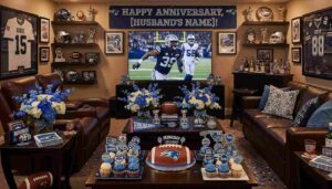 Sports-themed floral décor: Combine flowers with elements of his favorite team — like arranging blooms in his team’s colors or adding subtle décor around his prized memorabilia for a playful, personal twist.