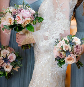 A pomander bouquet is a spherical or ball-shaped flower arrangement, often used in weddings or as a flower girl’s bouquet. It’s characterized by its round shape and may be held by a ribbon handle, worn on the wrist, and is often used by bridesmaids.