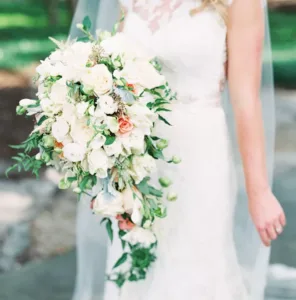 Cascade bouquet, also known as a waterfall bouquet, is a floral arrangement in which flowers and greenery are arranged to flow downwards, creating a trailing effect. The bouquet typically starts with a rounded base of flowers and gradually tapers down, often with trailing elements like vines or greenery, resembling a waterfall.