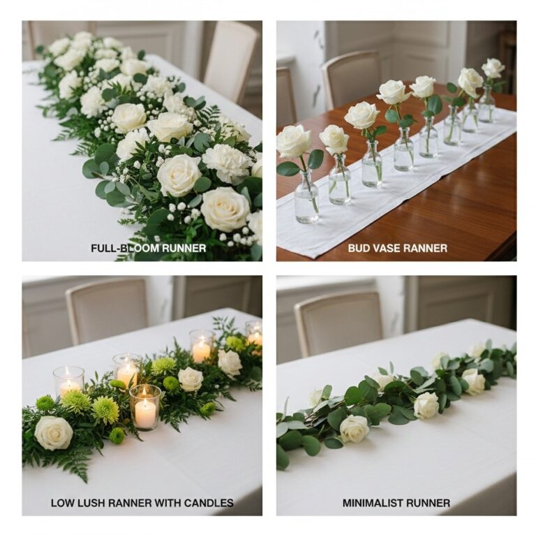 - Bud vase runner: Use small bud vases (7-11) with one flower type (white roses, red roses, or carnations) down the center of the table for a clean, modern look. Keep the vases low and evenly spaced for a photo-friendly setup.