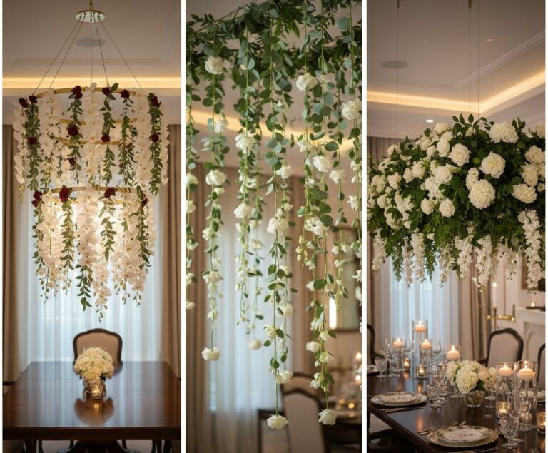 - “Floral Cloud” over the dining table: a soft rectangle of greenery and white blooms (white/green is a safe premium palette).