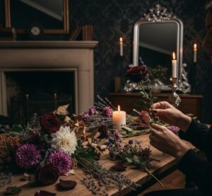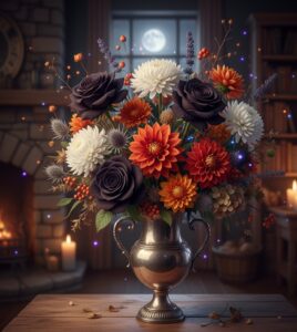 Popular Halloween flowers include black roses, chrysanthemums, dahlias, marigolds, dried flowers, and purple orchids. These are chosen for their colors and symbolism like black for mystery, chrysanthemums for remembrance, and marigolds for guiding spirits.