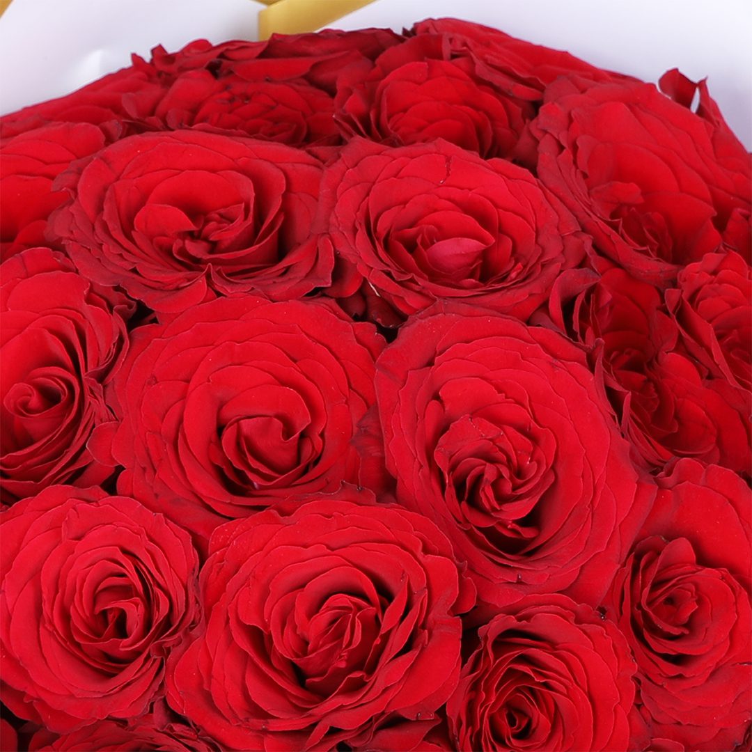 A classic 30 red roses bouquet wrapped in premium white and maroon sheets with a luxe gold edge, finished with a ribbon—perfect for Valentine’s Day, anniversaries, proposals, and romantic surprises.