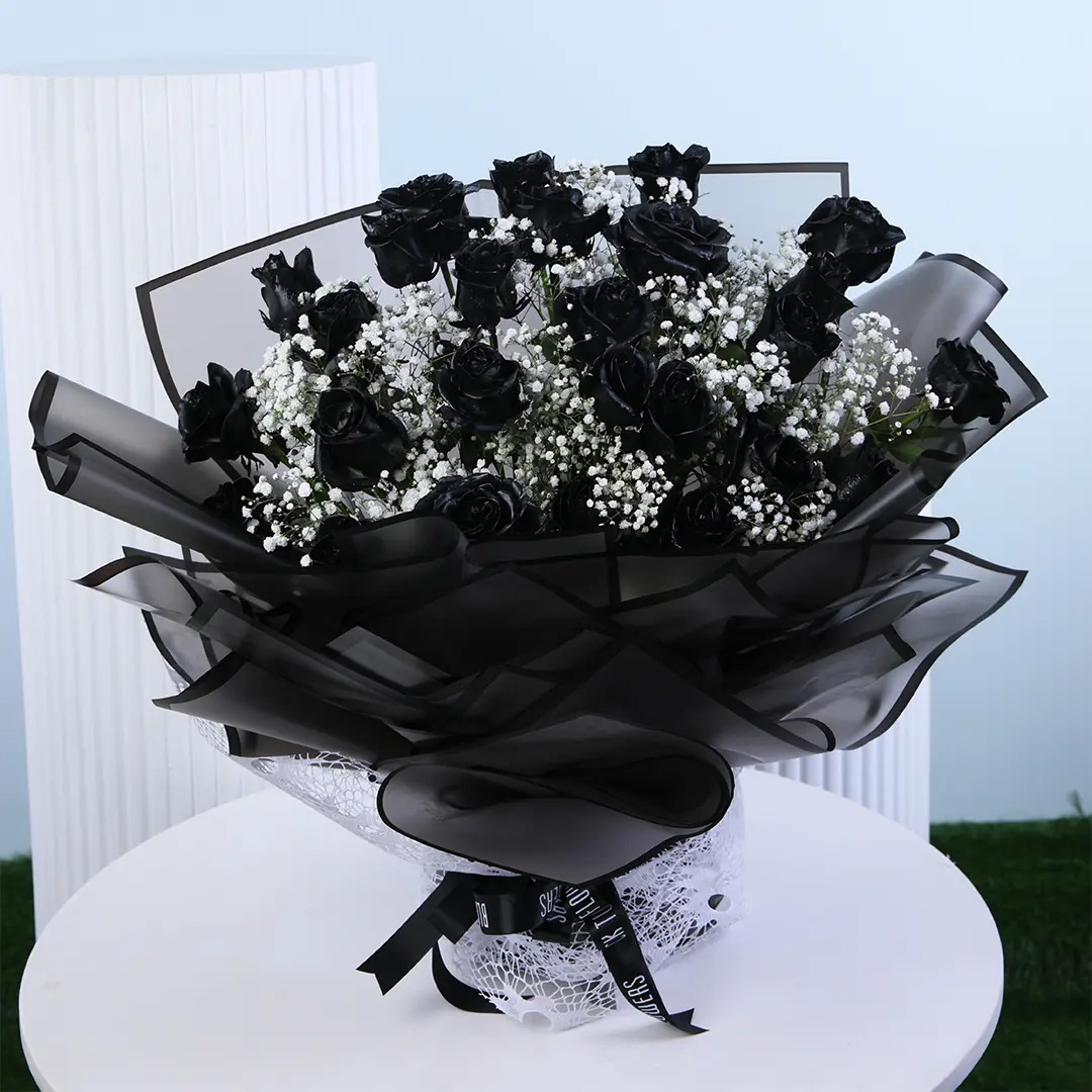 Luxe bouquet of black painted roses paired with delicate baby’s breath, wrapped in sleek black packaging—perfect for modern romance, birthdays, and statement gifting.
