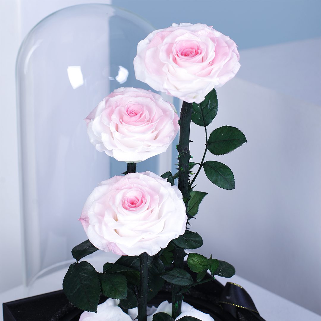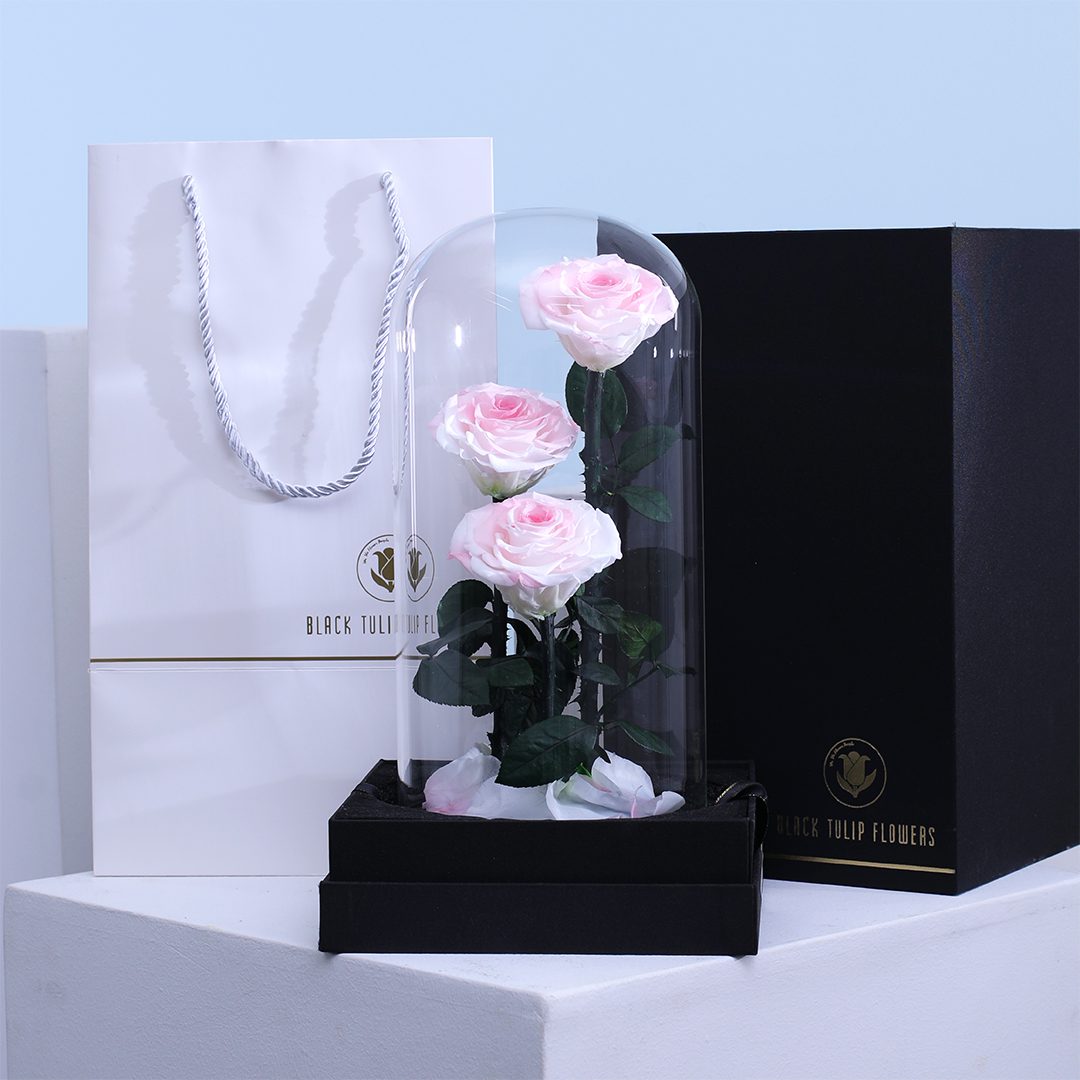 Blush pink trio preserved roses arranged beautifully inside a clear glass dome on a premium black base with delicate petals below is a timeless gift for anniversaries, milestones, and meaningful moments.