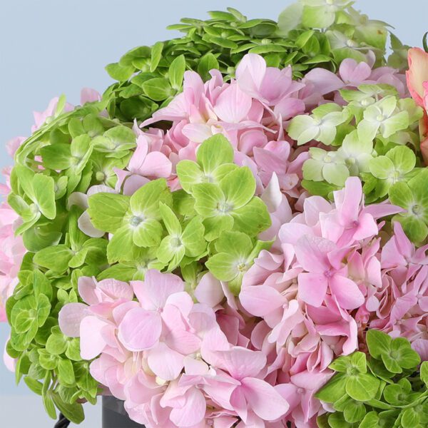 Soft green and light pink hydrangeas paired with pink double color roses, arranged in a sleek black box for a modern, elegant floral gifting experience.