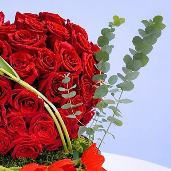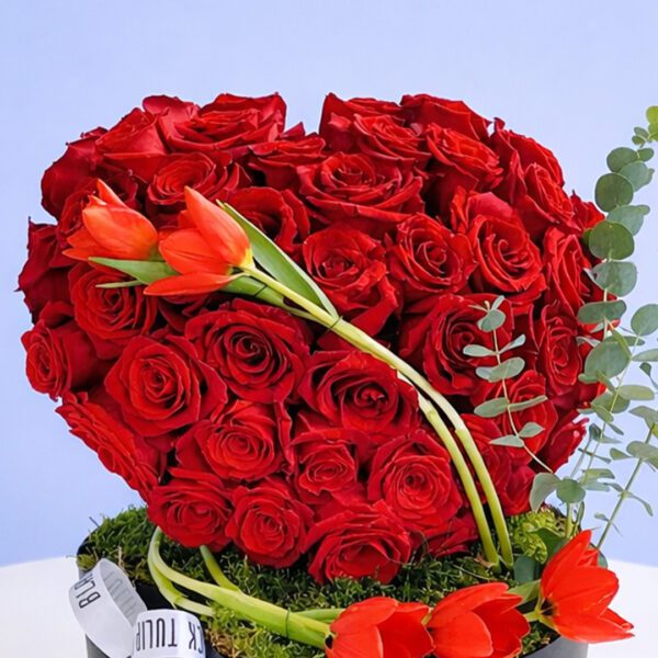 A stunning heart-shaped arrangement crafted with deep red roses and adorned with elegant green accents to convey your heartfelt emotions.