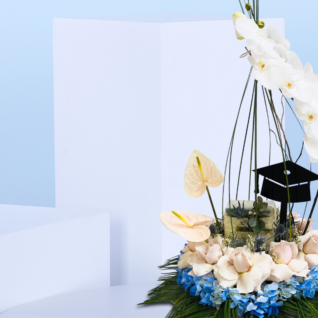 A circular arrangement of orchids, anthuriums, roses, hydrangeas, and foliage, highlighted with a graduation cap topper.