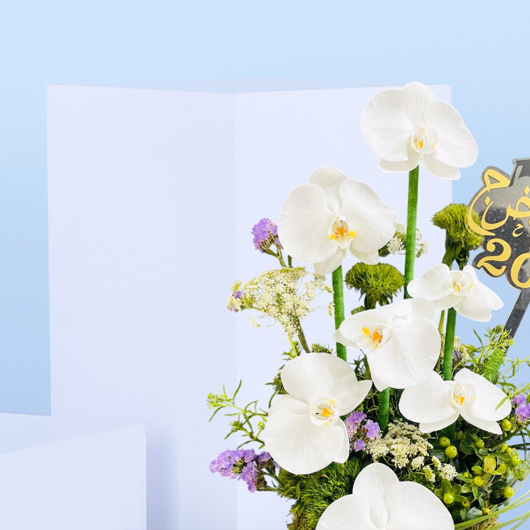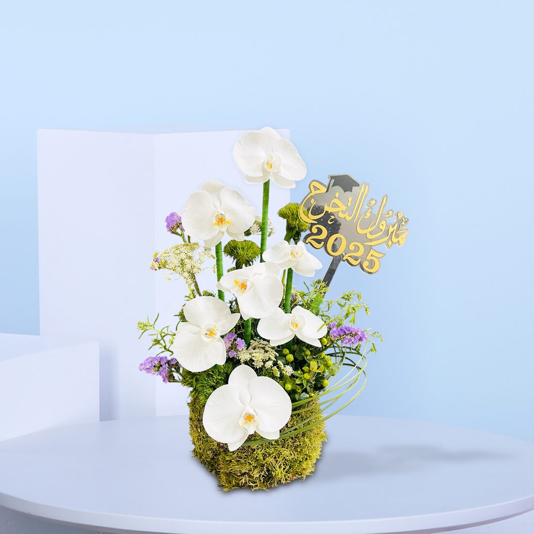 Celebrate success in style with our Elegant Orchid Graduation Arrangement 2025. Featuring stunning white orchids, fresh greens, and a golden Arabic “Congratulations 2025” topper, is a beautiful tribute to academic achievement and new beginnings.