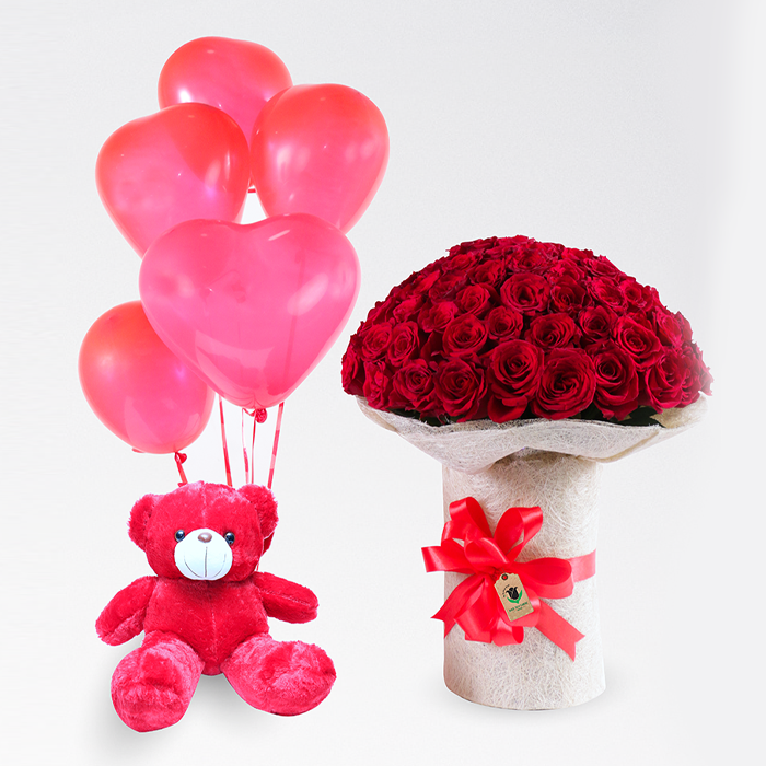 Our Loving Thoughts Combo is a beautiful bouquet of 50 stems red roses, 5 pcs Heart Shaped red balloons, 30cm Height Red Teddy Bear with a Free Standard Delivery within Qatar. This is a wonderful offer which is sure to make your lucky recipient happy.