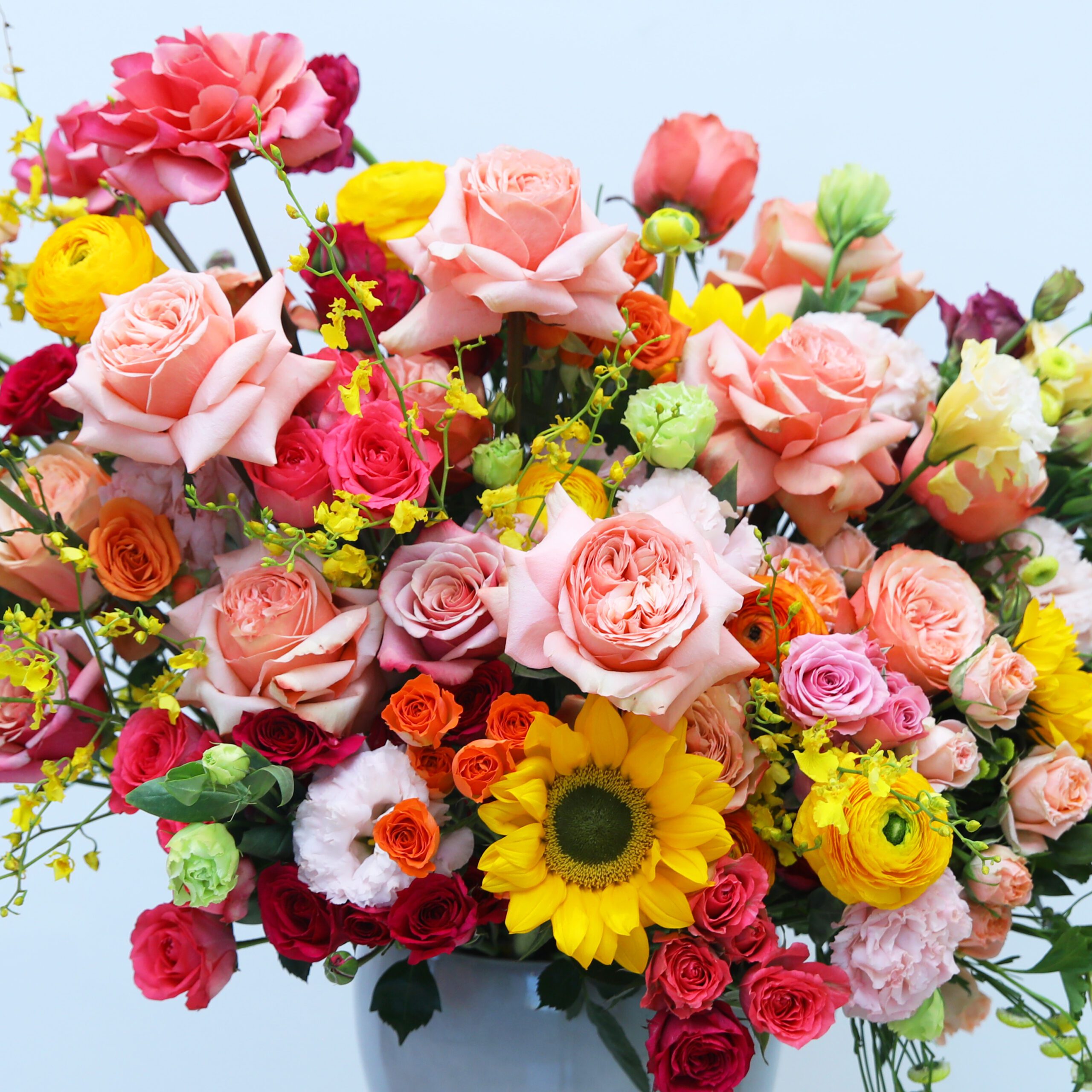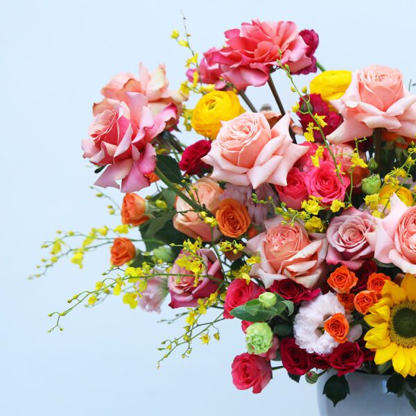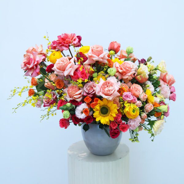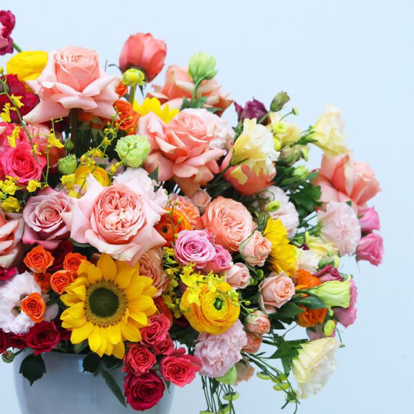 A vibrant mix of roses, sunflowers, and other seasonal blooms in a sleek vase, bringing warmth and charm to any space.