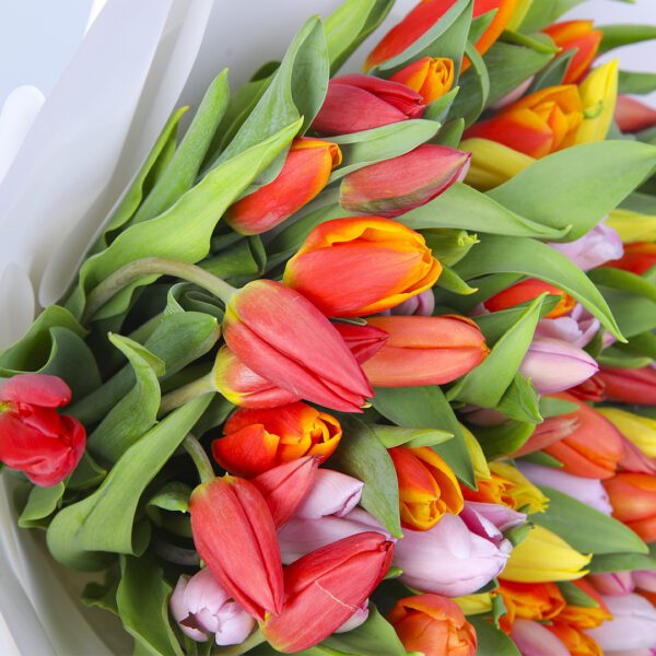 A mixed Tulip bouquet is a vibrant explosion of colors featuring tulips in shades of red, orange, yellow, and pink. The tulips are carefully arranged and wrapped in elegant white paper with a black ribbon, making it a perfect gift for any occasion.