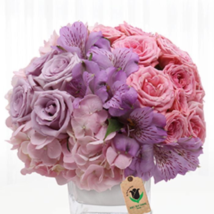 The cheerful bouquet includes light pink hydrangea, pink roses, purple roses and purple Alstroemeria delivered in a contemporary glass cube with a mirrored silver finish.