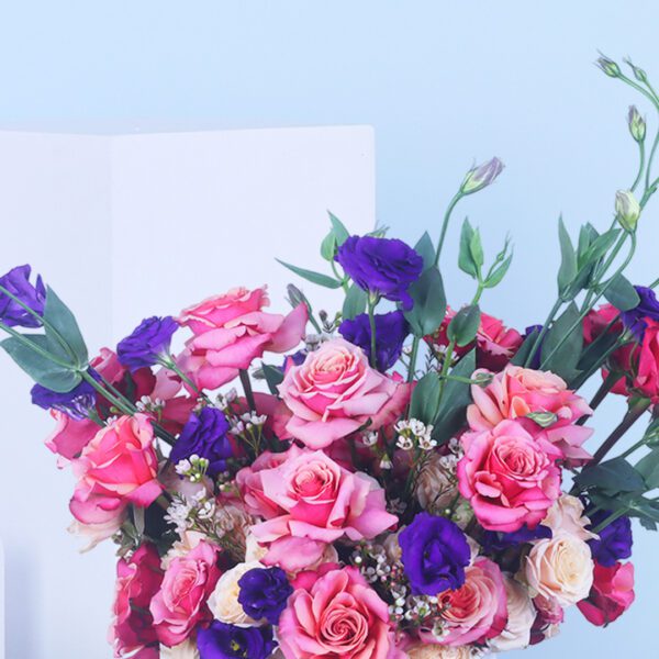 A luxurious mix of pink and purple blooms arranged elegantly in a chic round box—perfect for gifting and décor.