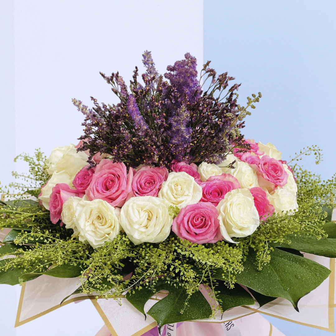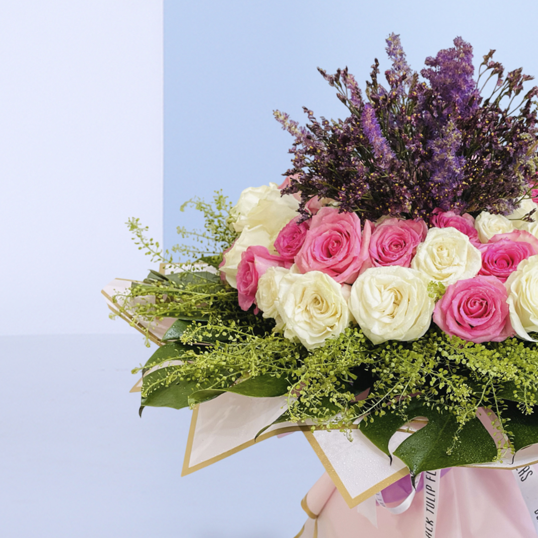 A luxurious bouquet featuring a harmonious mix of pink and white roses, lush greenery, and vibrant purple accents, wrapped in elegant pink.