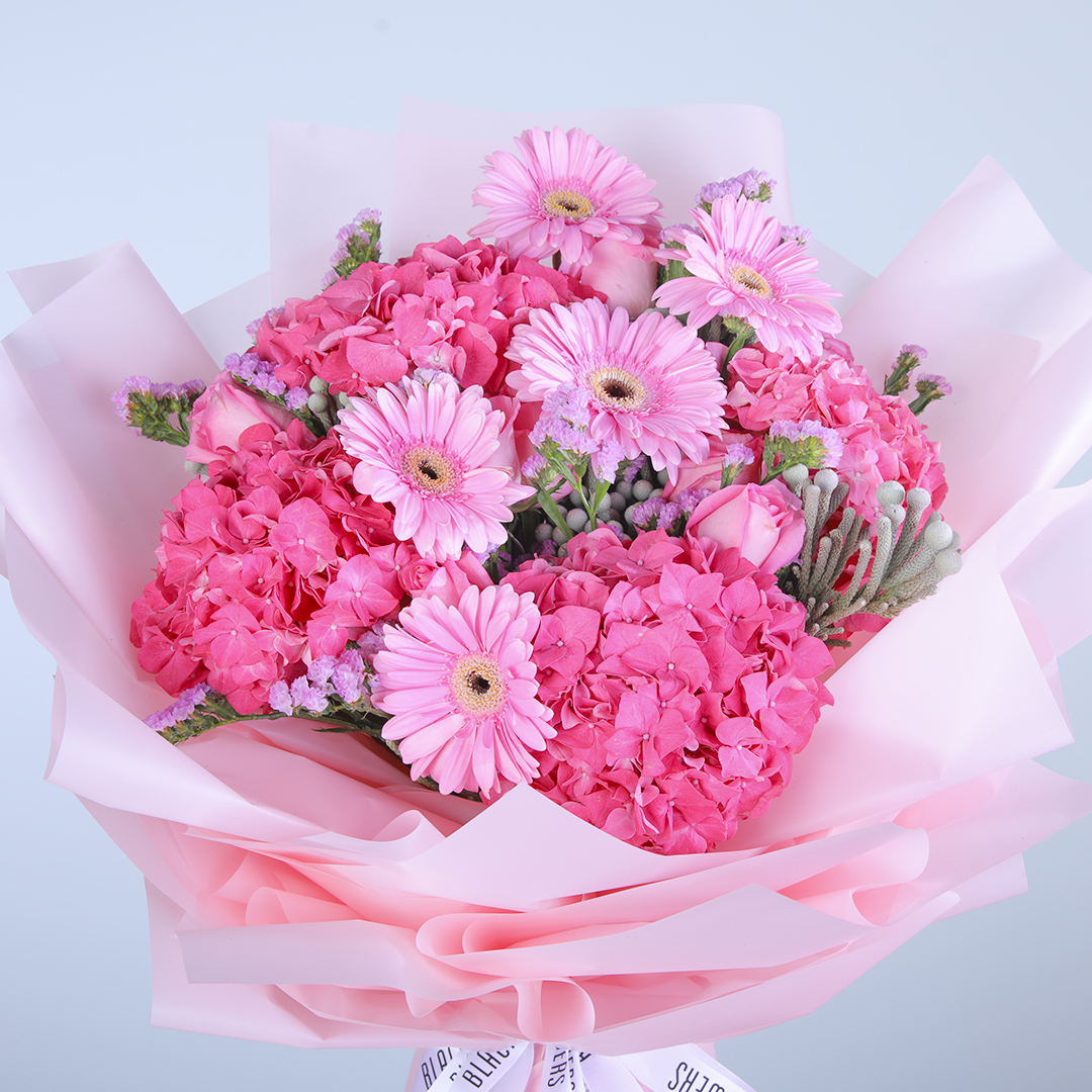 Our Pink Flower Bouquet features a harmonious blend of pink gerberas, hydrangeas, roses, and ferns. Its delicate charm and captivating fragrance will leave a lasting impression.
