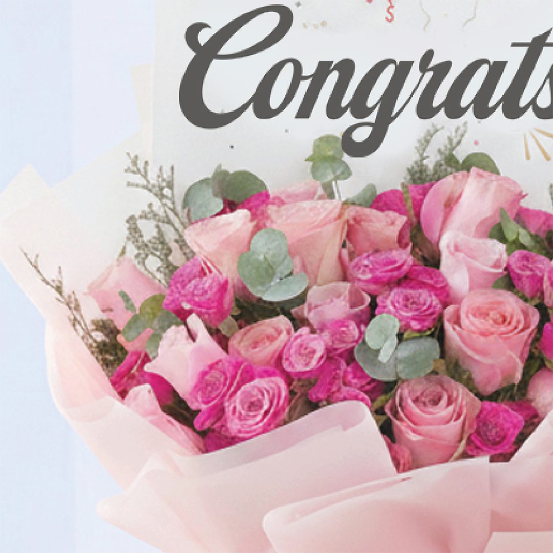 Send congratulations with our Pink Congrats Bouquet featuring hand-tied pink roses, spray roses & eucalyptus in blush wrap, finished with a “Congrats” card- perfect for promotions, graduations, and celebrations.