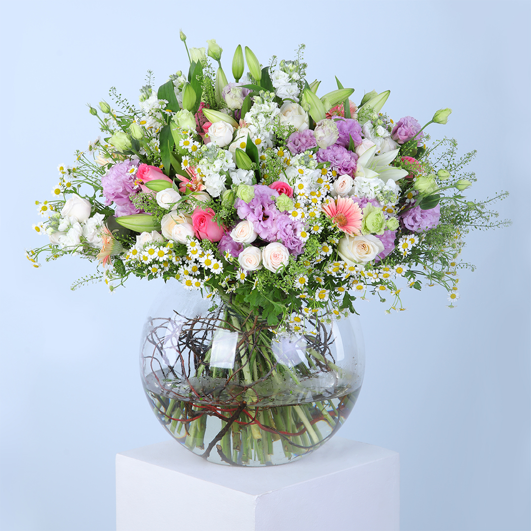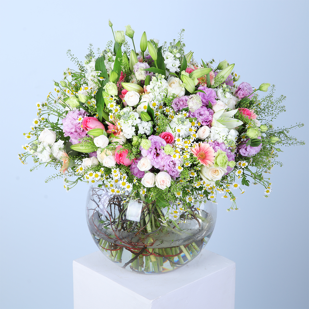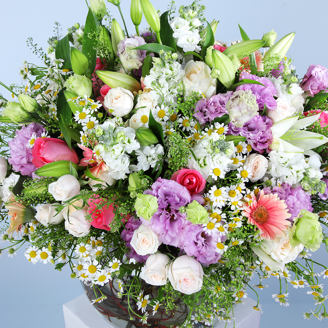 Immerse yourself in the beauty of soft hues and delicate blooms featuring pink gerberas, pink roses, white ohara lilies, tanacetum, bublurium, white lilies, mathiola, purple lisianthus, and white baby roses in a vase.