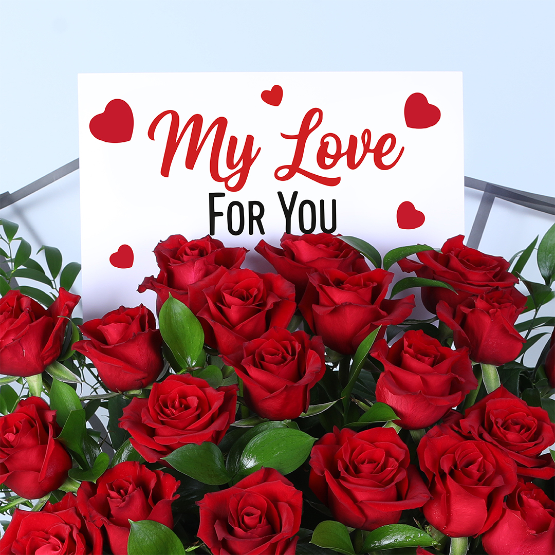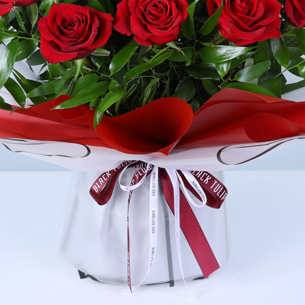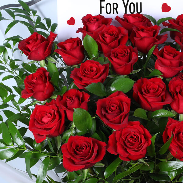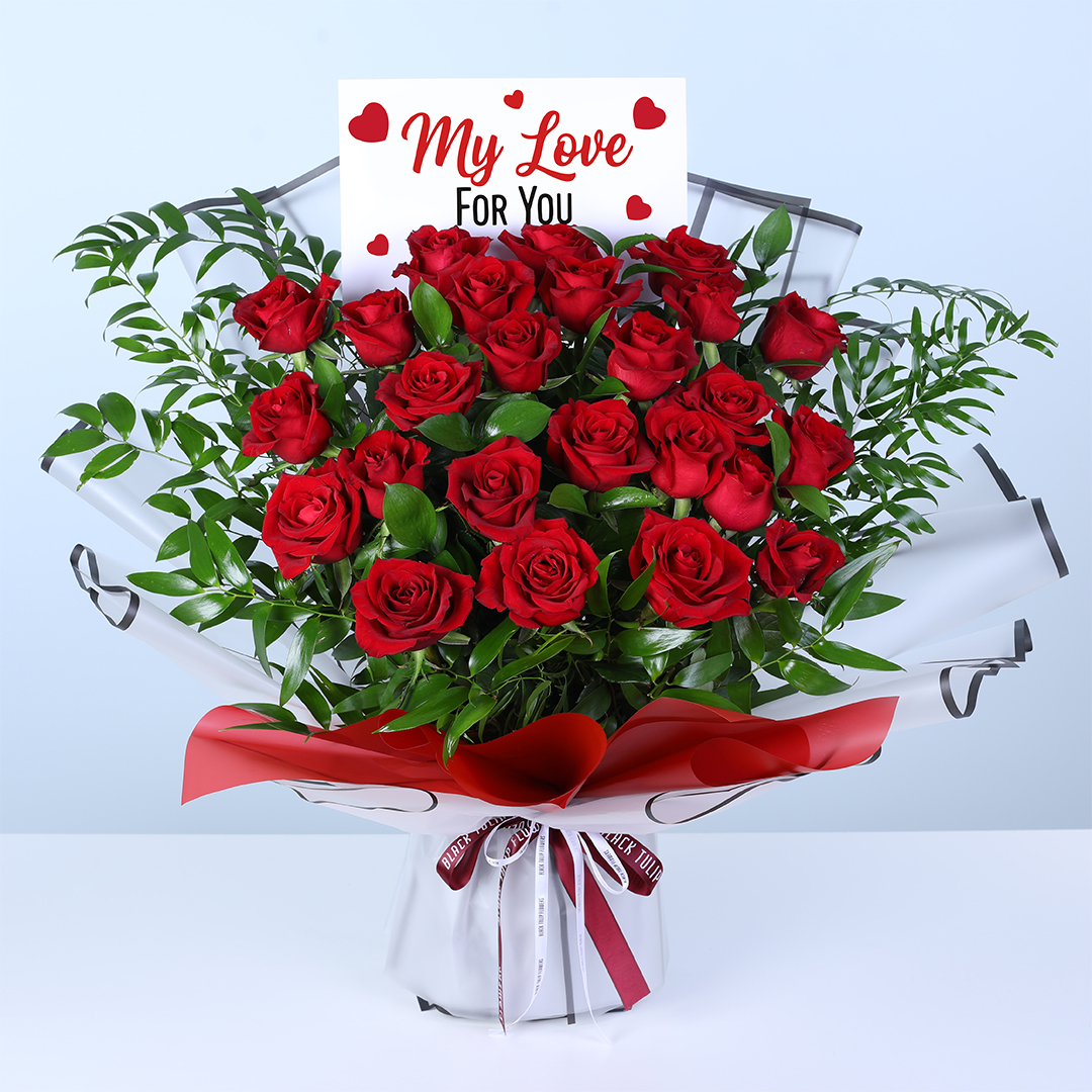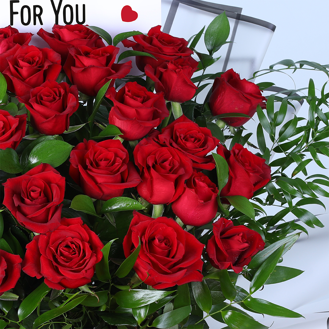 Share your love with 25 red roses, thoughtfully arranged with fresh green foliage and elegant wrapping. A timeless symbol of romance, this bouquet is perfect for Valentine’s Day, proposals, and special occasions.