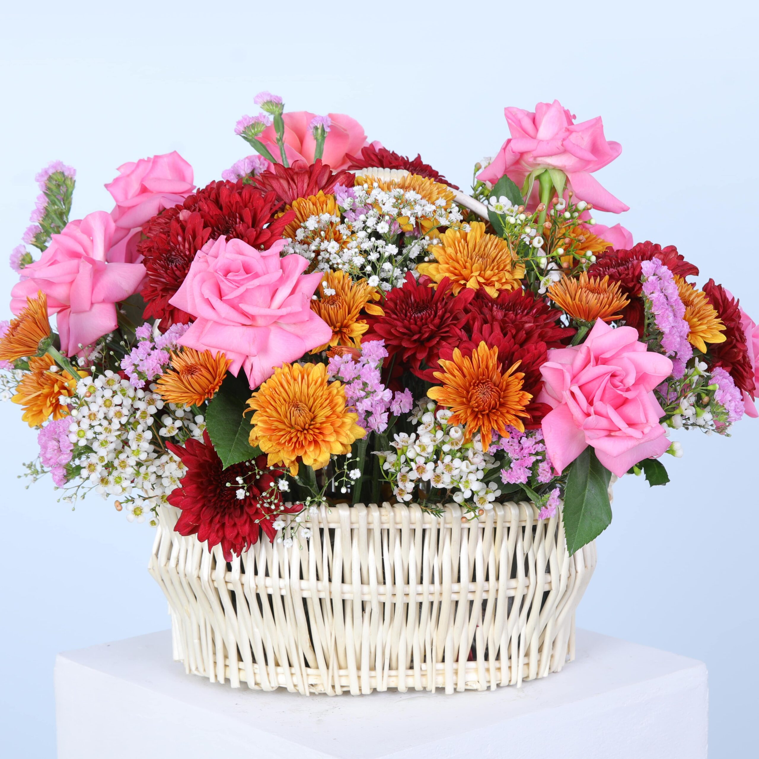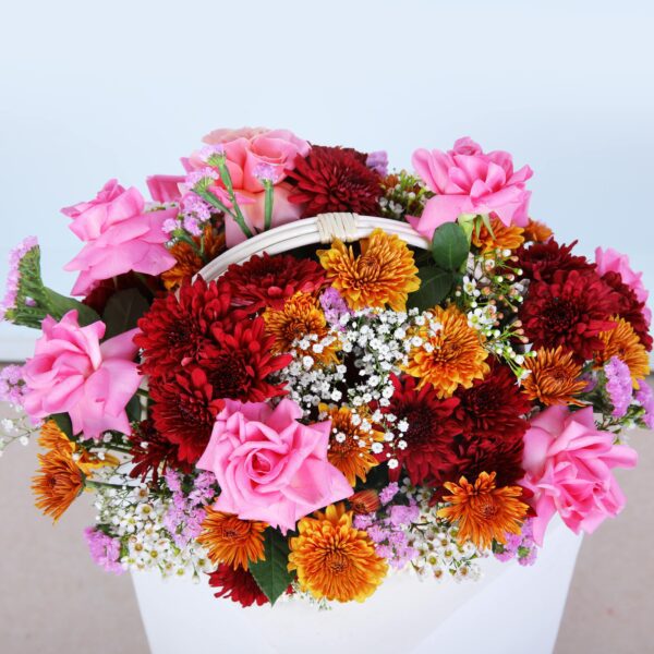 Brighten any space with this lively basket featuring pink roses, red and orange chrysanthemums, and vibrant statice flowers. Accented with wax flowers, this arrangement bursts with colour and charm, making it the perfect statement piece for any occasion.