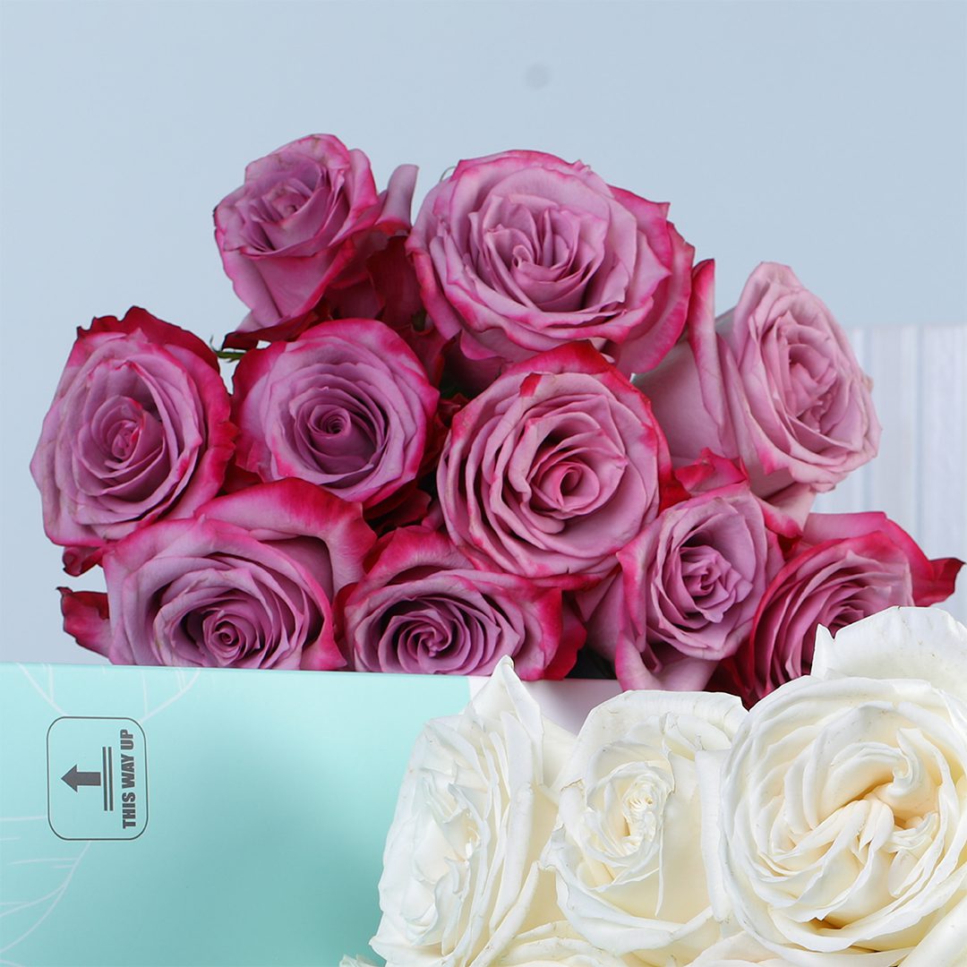 Where deep purple meets pure white—this rose bunch invites you to shape your own arrangement in the glass vase or as a bouquet and bring a calm, elegant mood to any space.