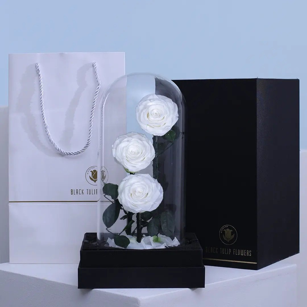 legance in its purest form – our preserved white roses. These timeless blooms radiate grace and beauty, offering a touch of sophistication to any space. A symbol of purity and serenity, they make an exquisite gift or a statement piece for your decor.